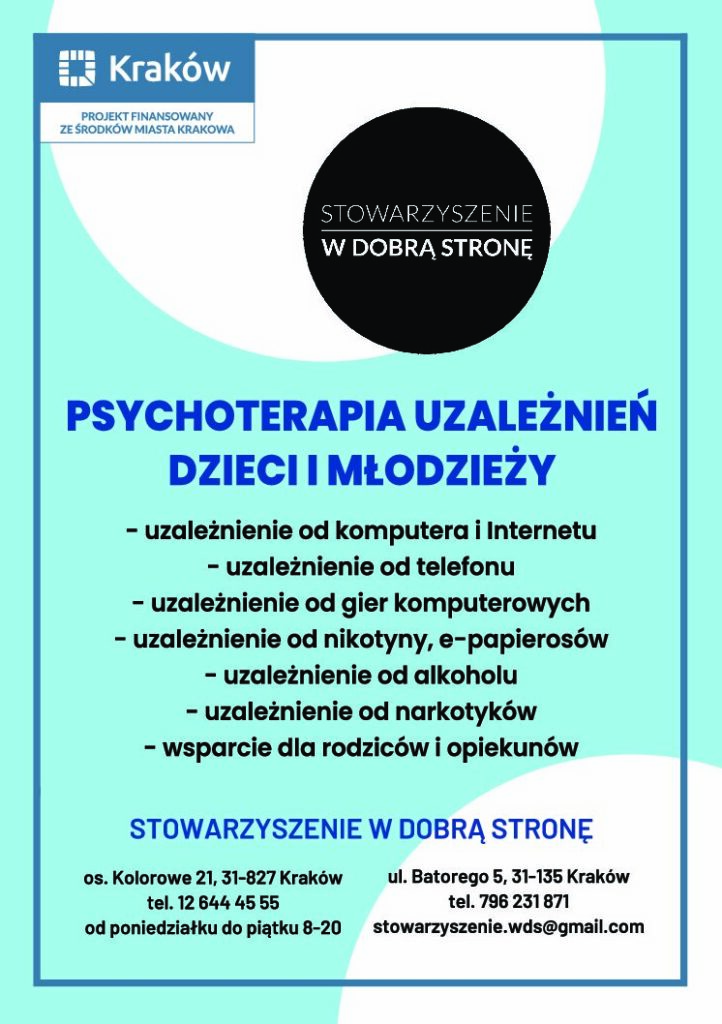 Poradnia Leczenia Uzależnień dla Dzieci i Młodzieży prowadzona przez Stowarzyszenie W Dobrą Stronę (numer księgi rejestrowej Wojewody Małopolskiego 000000224321) z Krakowie w dwóch lokalizacjach: w Śródmieściu przy ul. Batorego 5 i w Nowej Hucie na os. Kolorowym 21 oferuje studentom do 26 roku życia konsultacje diagnostyczne, poradnictwo i psychoterapię w obszarze uzależnień.